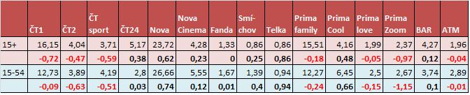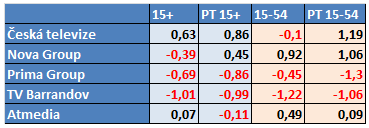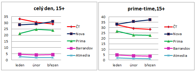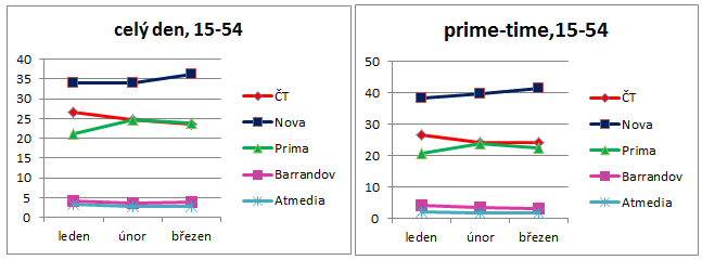 Ve skupině diváků starších 15 let se tak podíl skupiny Nova zvyšuje od ledna, naopak souhrnný podíl stanic České televize se mírně snížil. Prima, které v únoru pomohl start kanálu Prima Zoom, zůstala v březnu lehce za svým celkovým únorovým podílem. TV Barrandov v březnu zastavila několikaměsíční pokles.