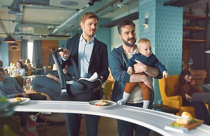 V prvním případě dva muže v jídelně výrobek zaujme natolik, že jeden z nich zapomene své dítě na jedoucím vydávajícím pásu. Reklama je na sýr Philadelphia.