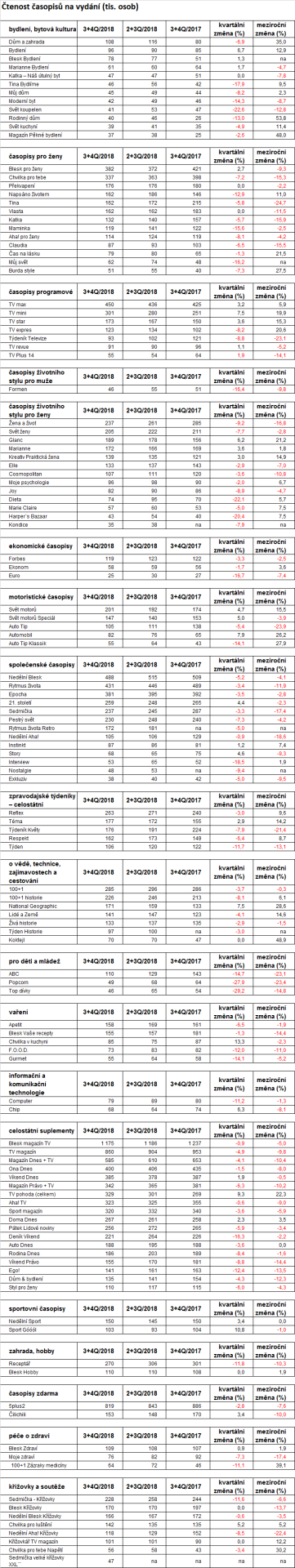 Časopisy čte 64 procent české populace ve věku 12-79 let. Podle dat výzkumu čtenosti Media projekt za 3. a 4. čtvrtletí 2018 se ve srovnání s předcházejícím měřeným obdobím zvýšila čtenost časopisů sportovních, programových a také magazínů ze segmentu auto-moto. Mezi tituly, které si v těchto sledovaných obdobích nejvíce polepšily, patří magazíny Chvilka v kuchyni, Sport Góóól, TV pohoda, Automobil, National Geographic, TV mini a Bydlení.