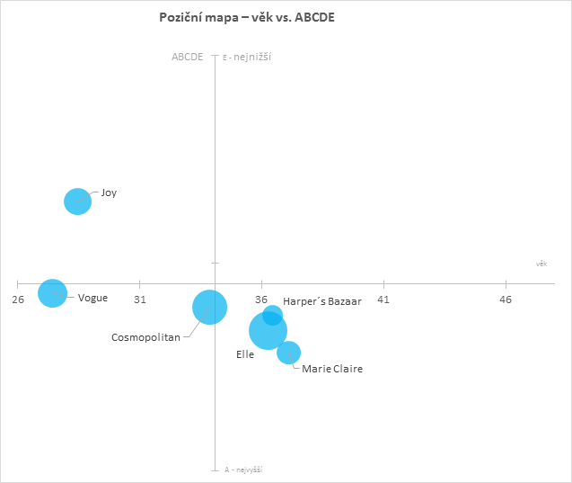 Parametr věku pomyslně rozděluje tuto skupinu na dvě části – časopisy pro mladé čtenářky (Cosmopolitan, Joy a Vogue) a zralé ženy (Elle, Harper´s Bazaar a Marie Claire). Průměrný věk čtenářek je zde 34 let.