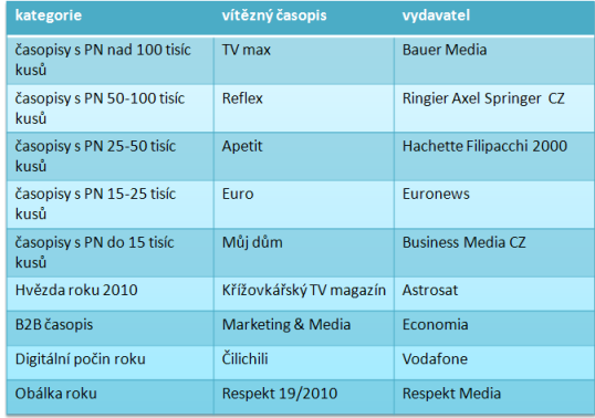Mezi vítěze se tak letos už popáté v historii soutěže zařadil Reflex, pošesté Apetit, Respekt zvítězil dokonce po sedmé (stejně jako vloni i letos uspěl v kategorii Obálka roku), Marketing & Media po čtvrté. Trošku oprašovat vítězné pocity musel Čilichili, který bodoval poprvé před třemi lety. Letos byl ale úspěšný v kategorii digitální počin roku, takže vítězství mu patří za internetový projekt. Také programový TV max už na nejvyšší ocenění dosáhl, a to rovněž před třemi lety, stejně jako týdeník Euro, který si titul Časopis roku odnesl hned v prvním ročníku.