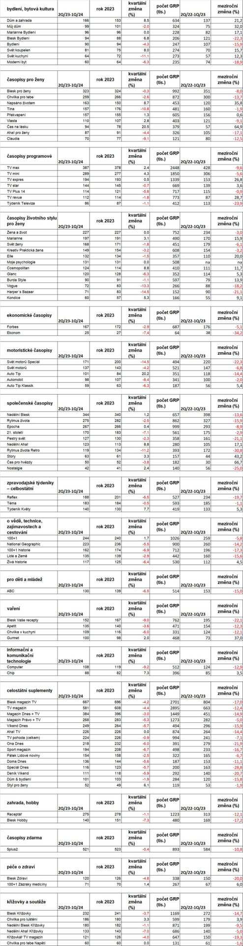 K nejčtenějším časopisům nadále paří magazíny společenské, programové a pro ženy. Nejvyšší nárůsty si připsaly časopisy Čas na lásku a Auto Tip ve srovnání s daty za rok 2023 a pokud by se zohlednilo i meziroční srovnání, tak se k nim řadí i Čas pro hvězdy.