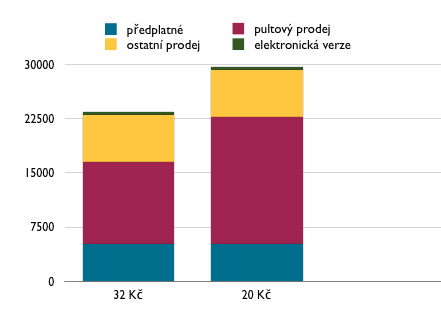 Prostým součinem zjistíme, že výnos z „dražšího” vydání je i přes jeho nižší prodej vyšší – cca 750 tis. Kč (vs. 600 tis. Kč při prodeji za 20 Kč) a zůstává vyšší i po odečtení nákladů na distribuci, které se snižují s poklesem prodejní ceny.