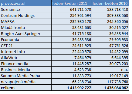Oproti loňsku se výrazně vylepšily výsledky vydavatelství Mladá fronta, které si meziročně polepšilo o více než 90 %, což bylo dáno zejména akviziční politikou v loňském roce. Další z vydavatelských domů – Ringier Axel Springer a Economia – mají v letošním roce na internetu také lepší výsledky než vloni, a to o cca 14 %, resp. 21 %. Naopak nižší příjmy z internetu letos zaznamenává mediální dům Sanoma Media a také společnost CET 21, provozovatel TV Nova.