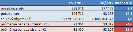 Ve srovnání s loňským prvním pololetím je počet proinzerovaných stran letos vyšší o 12 %. To letos představuje snížení průměrné ceny za jednu celostranu o 13 % oproti prvnímu pololetí 2012. Průměrná cena za jeden inzerát je pak podle monitoringu letos nižší o 5 %.