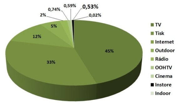 Televize má oproti tištěné reklamě navrch o necelých 400 milionů. Následuje internet s 365 miliony korun, který si oproti minulému měsíci pohoršil o více než 90 mil. Kč. Outdoor také zaznamenal propad, a to o 100 mil. Kč. Rádio uzavírá stálou pětku s 62 miliony.