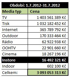 Červencový žebříček mediatypů podle zdroje Admosphere je, s výjimkou změny pořadí „Cinema“ a „Instore“, totožný. Celkově však investice klesly z téměř 5 miliard korun na pouhé miliardy tři!