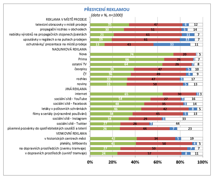 Nejvíce Čechy obtěžuje intenzita reklamy na komerčních televizních stanicích, internetu a sociálních sítích. Nejkladněji je přijímána reklama v místě prodeje, zvláště pokud jde o ochutnávky a různé prezentace. Tyto postoje se v čase příliš nemění.