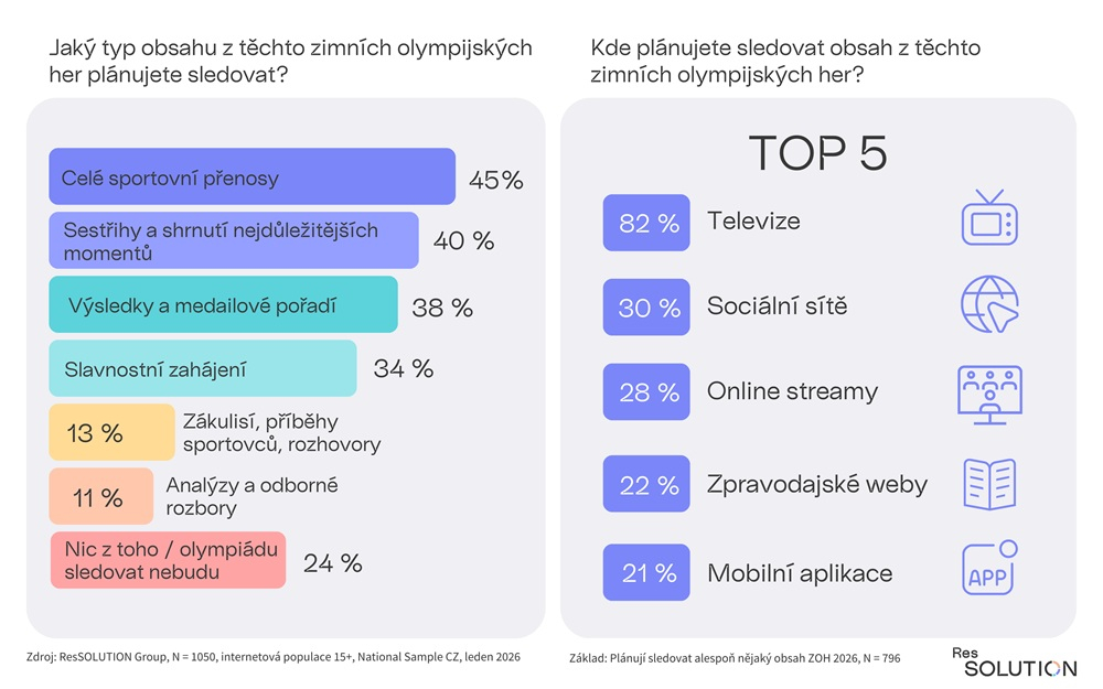 Hlavním médiem pro sledování nadcházejících Zimních olympijských her (ZOH) v Miláně a Cortině zůstává mezi českými diváky televize. Podle výzkumu společnosti ResSolution Group pro MediaGuru.cz plánuje televizní vysílání využít 82 % těch, kteří se chystají olympiádu sledovat. S výrazným odstupem následují sociální sítě (30 %) a online streamy (28 %).