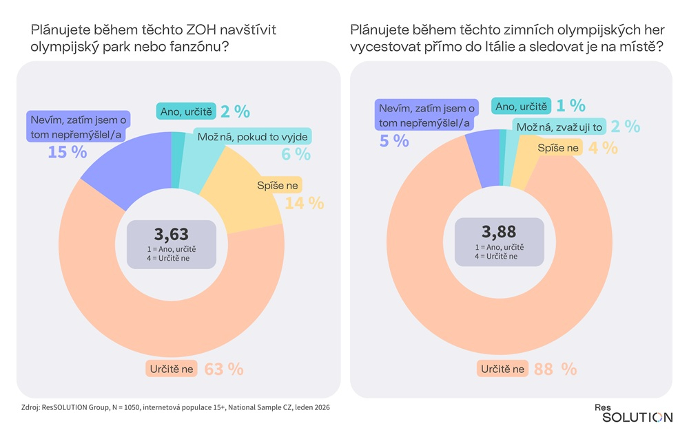 Osobní účast na olympijských akcích zůstává okrajovou záležitostí. Návštěvu olympijských parků nebo fanzón v Česku plánuje pouze 8 % dotázaných, především z mladší věkové skupiny. Vyrazit přímo do Itálie za sportovními soutěžemi chce jen minimum lidí – pevně rozhodnuto vycestovat je 1 % respondentů, zatímco 88 % cestu jednoznačně odmítá.