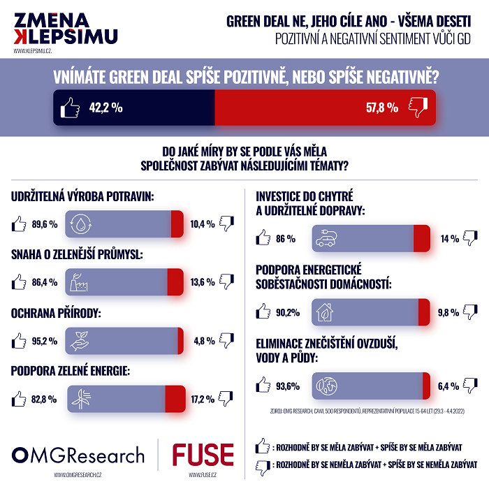 Česká populace v drtivé většině podporuje šetrnější přístup k životu. Pro větší pozornost ochraně přírody, podpoře energetické soběstačnosti nebo udržitelné výrobě potravin, se vyslovilo přes 90 % respondentů. Zároveň se ale 58 % z nich staví ke Green Dealu, který tato témata řeší, negativně. Ukázal to březnový průzkum Omnicom Media Group pro Změnu k lepšímu a Hnutí Duha.