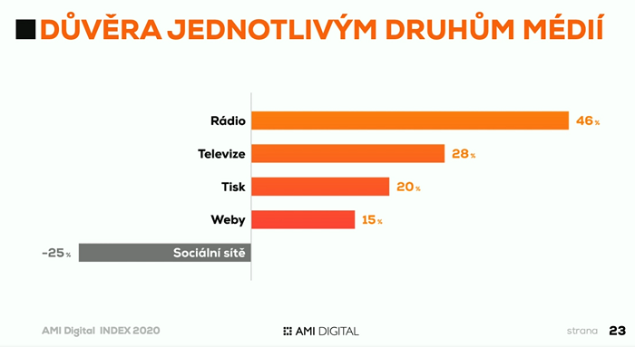 Výzkum také zjišťoval, jak čeští internetoví uživatelé důvěřují médiím. Nejvyšší tzv. čistou důvěru (rozdíl počtu lidí, kteří velmi důvěřují a důvěřují, od lidí, kteří velmi nedůvěřují a nedůvěřují), mají rádia, televize a tisková média. Naopak sociální sítě jsou v hodnocení uživatelů vnímána jako nedůvěryhodná. „Jde o opačný trend než v konzumaci těchto médií, kdy méně sledované mediatypy jsou označovány za nejdůvěryhodnější," uvedl Jan Kučmáš, partner AMI Communications.