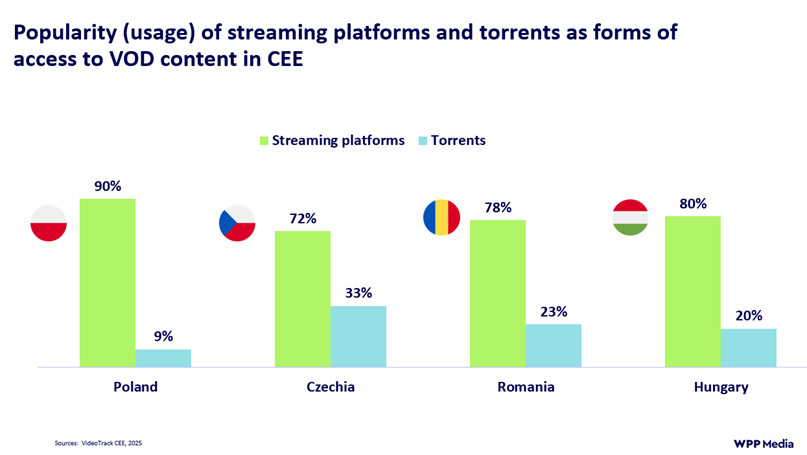 Až třetina českých online diváků (33 %) stále stahuje filmy a seriály z internetu, zatímco například v Polsku je to jen 9 %. Tato vyšší míra pirátství koreluje s nižší ochotou Čechů za videoobsah platit, když Česko má nejnižší podíl platících SVOD uživatelů v celém regionu.