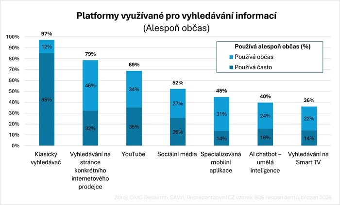 Klasické vyhledávače zůstávají nejvyužívanějším zdrojem při hledání informací na internetu. Následují vyhledávání na stránce konkrétního prodejce, na YouTube a sociálních médiích. Až 40 % uvedené populace už má ale zkušenost s vyhledáváním na internetu pomocí AI. Data přináší nová výzkumná studie OMG Research, která se zaměřila na měnící se prostředí online vyhledávání informací. Uskutečnila se na reprezentativním vzorku české populace, celkem bylo dotazováno 806 Čechů ve věku od 15 do 49 let.