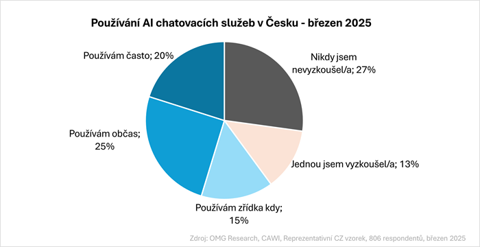 Obecně s používáním AI (nejen s vyhledáváním) má zkušenost 60 % Čechů ve věku 15-49 let. Přibližně pětina nemá doposud žádnou zkušenost s AI a 13 % Čechů AI chatování zatím jen jednorázově vyzkoušelo a používat ho zatím nezačali.