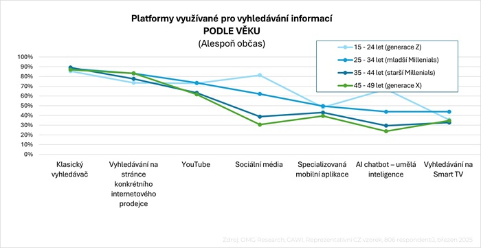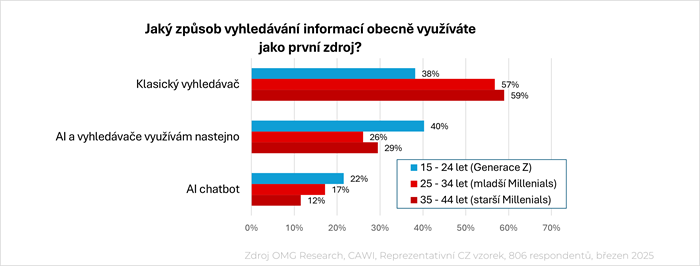 Výzkum také zjišťoval, jaký způsob vyhledávání informací použijí Češi jako první volbu. Většina momentálně stále ještě začíná vyhledávat v klasickém vyhledávači (53 %), třetina (32 %) použije rovnoměrně (střídá) klasický vyhledavač a AI a 15 % upřednostní AI. V generaci Čechů 15-24 jsou už ovšem odpovědi výrazně vychýlené v prospěch AI. Použití AI preferuje ve vyhledávání pětina mladých (22 %), klasický vyhledavač upřednostní 38 % mladých.