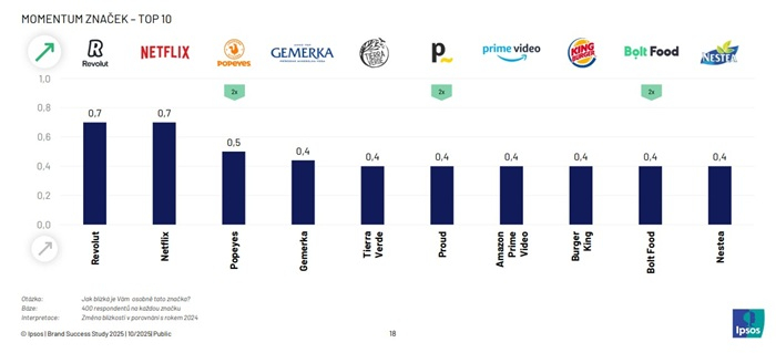 Největší meziroční pozitivní posun zaznamenaly značky Revolut, Netflix a Popeyes. Z hlediska růstu jsou zajímavé především Popeyes, Proud a Bolt Food, které vzrostly dva roky po sobě.