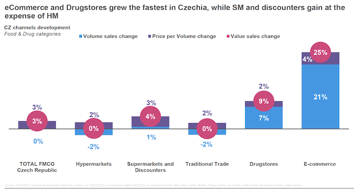 V České republice nejrychleji rostou online obchody a řetězcové drogerie, následují je supermarkety a diskonty. Naopak hypermarkety a prodejny s menší prodejní plochou (tzv. tradiční trh, do 400m2) aktuálně nejsou na růstové trajektorii.