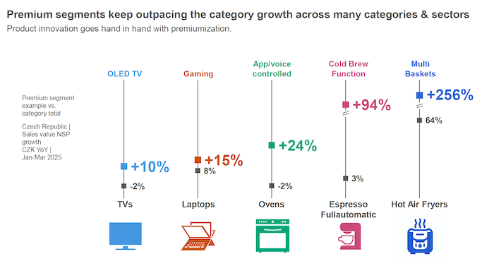 Prémiové segmenty tak předstihují růst kategorií v mnoha sektorech, příkladem mohou být OLED televizory, herní notebooky, trouby ovládané aplikací či hlasem, plně automatické kávovary s funkcí cold breč nebo multifunkční horkovzdušné fritézy.