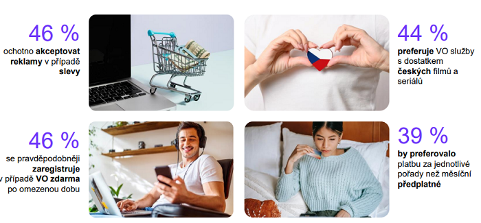 Průzkum dále ukázal, že necelá polovina české internetové populace (46 %) je ochotna akceptovat v nabídce tuzemských videostreamingových služeb reklamy, pokud se odrazí v nižší ceně předplatného. Stejný počet uživatelů (46 %) se také pravděpodobněji zaregistruje v případě, že získá po omezenou dobu možnost konzumovat videoobsah zdarma. Velká část českých diváků také dává přednost takovým streamingovým službám, v jejichž nabídce se objevuje dostatek českých filmů a seriálů – vyslovilo se tak 44 % respondentů. A téměř 40 % uživatelů by preferovalo platbu za jednotlivé pořady než měsíční předplatné.
