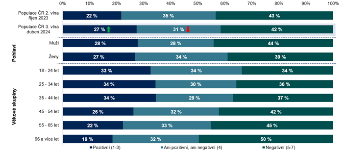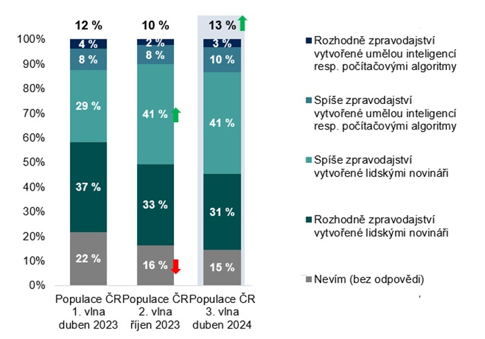 Oproti druhé vlně z října 2023 se pozitivní vnímání AI v žurnalistice mírně zvýšilo (o 5 procentních bodů na 27 %), naopak negativní vnímání zůstalo na téměř stejné úrovni (42 %). Přesto ale negativní vnímání stále převažuje nad pozitivním. Mezi druhou a třetí vlnou se zároveň snížil ambivalentní postoj na 31 % (ani pozitivní, ani negativní).