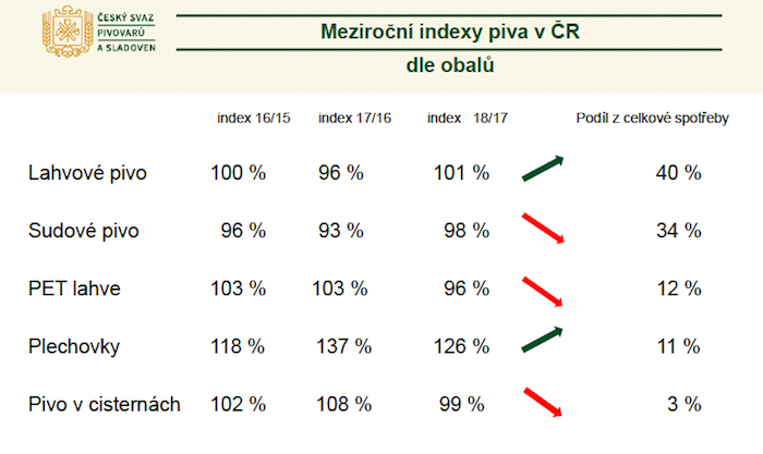 Balené pivo se na prodeji podílí 64 %. Nejvíce se prodává pivo lahvové (40 %) a sudové (34 %). O více než čtvrtinu narostla spotřeba piva v plechovkách (10 %), naopak klesla piva v PET lahvích (-4 %).