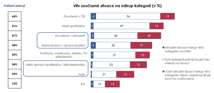 Také nakupování se začíná blížit k chování z doby před covidem. Zvyšuje se počet nakupujících v kamenných obchodech – 77 % uvedlo, že kamenné obchody navštěvuje podobně jako před nástupem pandemie. Zvyšující se ceny za energie ale vedou k rostoucí opatrnosti. Až 73 % si kvůli rostoucím cenám elektřiny a plynu více hlídá spotřebu v domácnosti a také si více hlídá, za co peníze utratí (71 %). Také podíl těchto lidí narůstá. Negativní vliv současné situace na nákup je nejvíce patrný u dovolené v zahraničí, rekonstrukce bydlení a nákupu velkých spotřebičů a aut.