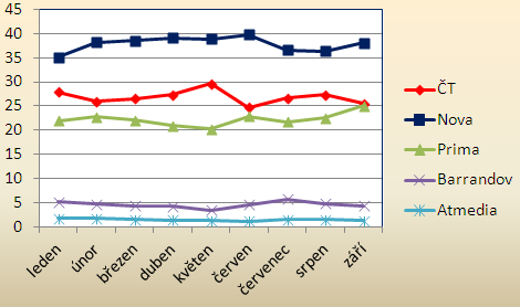 Česká televize ztrácí pozici dvojky v hlavním vysílacím čase (prime-time). Souhrnný podíl všech kanálů České televize (ČT1, ČT2, ČT4 a ČT24) v prime-time ve skupině diváků starších 15 let klesl v září na 25,56 %. To je druhý nejhorší letošní výsledek po červnu. Také z toho důvodu se na pozici České televize dotáhla skupina Prima (Prima, Prima Cool, Prima Love), jejíž souhrnná hodnota v prime-time dosáhla v září u diváků starších 15 let 25,08 %.