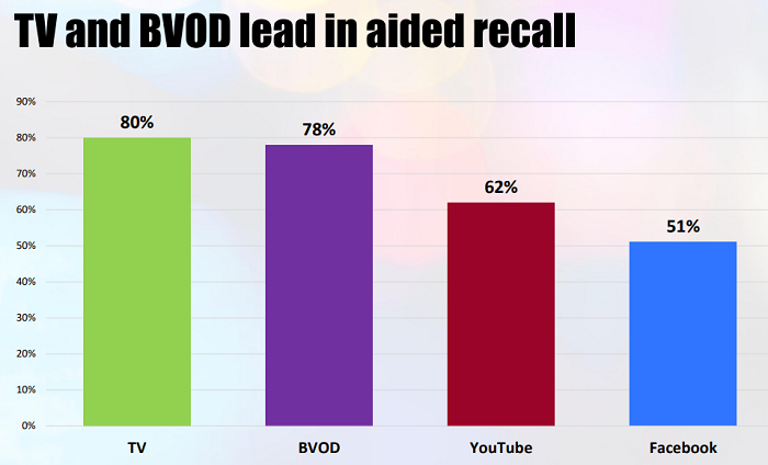 Podpořené vybavení reklamy je ze sledovaných platforem v Česku nejvyšší v případě, že je reklama sledována na televizní obrazovce (80 %) a z BVOD (78 %), následované Youtube (62 %) a Facebookem (51 %). Také spontánní vybavenost reklamy je nejvyšší v televizi (63 %) a BVOD (52 %). Obě zmíněné mají také nejvyšší šance z pohledu vnímání reklamy, což souvisí s viditelností reklamy, pozorností věnované obrazovce a velikosti zobrazení reklamy.
