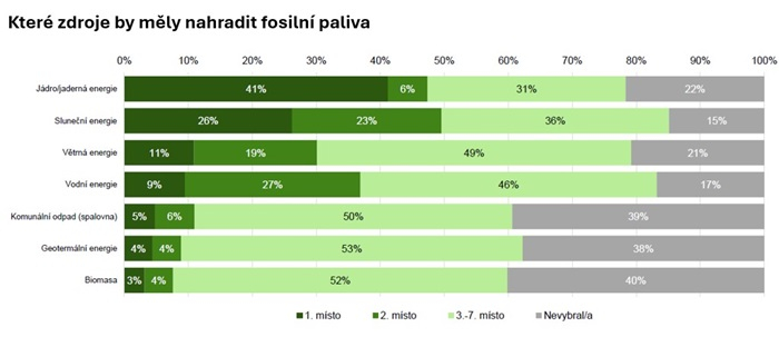 Průzkum také potvrdil dlouhodobou českou podporu jaderné energie a energetické soběstačnosti. Téměř dvě třetiny respondentů uvedly, že jádro by mělo být považováno za čistý zdroj. Pro více než 40 % reprezentuje nejvhodnější náhradu za fosilní paliva. Podle naprosté většiny respondentů (83 %) by stát měl být plně soběstačný ve výrobě elektřiny.