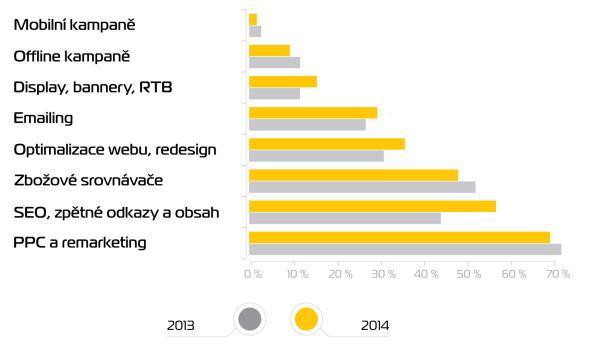 Nejvíce prostředků stále vkládají do optimalizace pro vyhledávače, výroby obsahu, PPC reklamy a zbožových srovnávačů, což odpovídá stavu i před několika lety,“ vysvětluje Ondřej Klega ze společnosti Acomware, a dodává: „Nové formy reklamy jako RTB nebo investice do emailingu a sociálních sítí jsou zatím okrajové.“ Sociální sítě přitom mají e-shopy svůj potenciál, což dokazuje například e-shop Kytary.cz, specializující se na hudební nástroje. „Využíváme zejména YouTube, a to především k testování nástrojů. Lidé, kteří si chtějí koupit kytaru, si mohou ve videu poslechnout, jak daná kytara hraje, což je skvělý podpůrný argument k prodeji, a samozřejmě nám to slouží i k budování naší značky,“ popsal marketingový manažer e-shopu Kytary.cz Filip Černý. Kromě YouTube komunikují i na Facebooku, který e-shopu generuje až 4 % obratu.