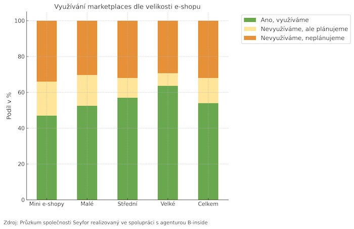 Většina oslovených e-shopů všech velikostí využívá jeden nebo více aktuálně dostupných marketplaces – střední i velké e-shopy velmi podobně rovnoměrně Heureku a Alzu/Mall/Allegro/Kaufland, v hojné míře na nich prodávají ale i malé e-shopy. Celkem je na nich aktivních 54 % e-shopů, dalších 14 % to plánuje.