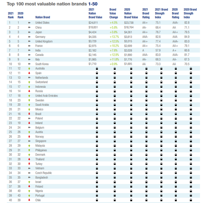 Na prvních deseti místech žebříčku TOP 100 nejcennějších značek ke změnám nedošlo. Nejsilnějšími značkami zůstávají USA, Čína a Japonsko. Všechny země umístěné v TOP 10 si meziročně mírně polepšily. Nejrychleji rostoucí zemí je v novém žebříčku Estonsko, které podle zprávy těží z rychlé digitalizace a meziročně v hodnocení poskočilo o 38 %. Naopak Myanmar a Etiopie spadly v novém žebříčku nejvýrazněji, a to kvůli občanským nepokojům a konfliktům.