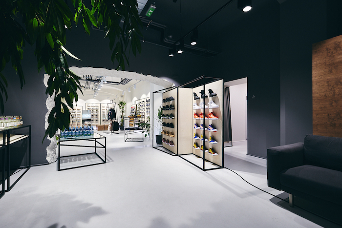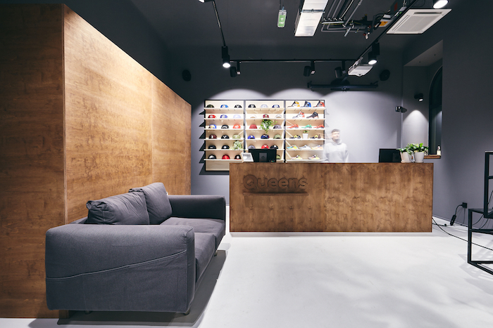 Prodejna je rozdělena na dva celky: ten vstupní, který je větší, slouží hlavně k prezentaci bot a oblečení. Na stěnách jsou speciální panely pro umístění limitovaných edicí tenisek. Dominantou první místnosti je neonový nápis Queens. Z tohoto prostoru pak zákazník plynule přechází do zóny pro placení a výdej online objednávek, kde jsou i zkušební kabinky. Předěl mezi oběma místnostmi designéři oproti původní dispozici rozšířili a opticky je propojili. Zachovali u něj strukturu neopracovaného materiálu, aby znázornili expanzi Queensu, který ke svému růstu potřebuje víc prostoru.