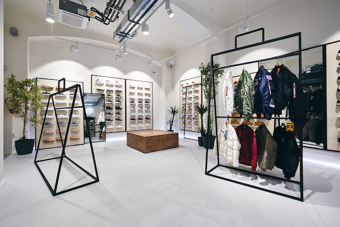 Nový obchod má 168 m2 prodejní plochy a 16 m2 venkovních výloh. „Náš cíl byl vytvořit vzdušný a lehce industriální, ale na druhou stranu funkční interiér, kde se bude zákazník cítit dobře. Nechtěli jsem to překombinovat, vybrali jsme si proto několik originálních dominant, třeba solitérní stojany na oblečení ve formě naddimenzovaných nákupních tašek a stolky, co vypadají jako krabice na boty. Bavilo nás pracovat se symbolikou firmy přenesenou do podoby grafických ikon,“ říká Lenka Damová, která je spolu se svým designérským kolegou Borisem Klimkem pod podobou prodejny podepsána.