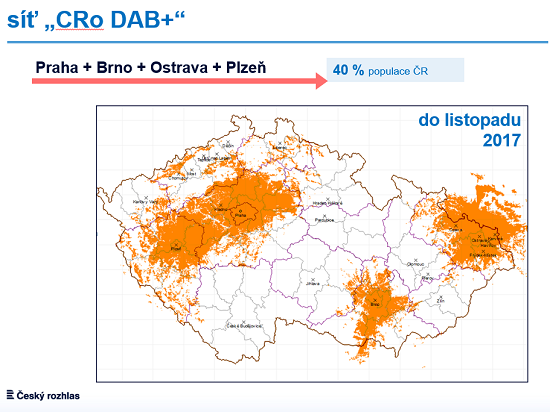 Vysílání DAB+ uvádí Český rozhlas (ČRo) ve spolupráci s Českými Radiokomunikacemi. Záměrem je do konce roku postupně rozšířit DAB+ vysílání na Ostravsko, Brněnsko a Plzeňsko tak, aby do konce roku bylo DAB+ pokryto 40 % české populace.