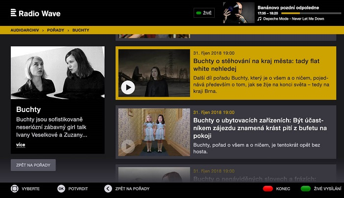 Český rozhlas nabízí od 11. ledna nově poslech z audioarchivu pomocí interaktivní HbbTV aplikace. Stává se tak prvním českým rádiem, které nabízí vlastní HbbTV aplikaci. Pilotní verze aplikace je dostupná na stávajícím kanále Radia Wave.