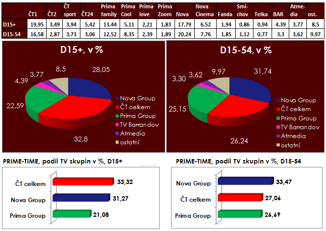 ČT1 patřil ve skupině 15+ i nedělní prime-time, nejvyššího podílu v hlavním vysílacím čase v mladší skupině 15-54 dosáhla Nova Group. Nedělní podíly v prime-time byly tentokrát vyrovnanější než v průběhu týdne – zejména v mladší skupině 15-54 se prosadily i tematické stanice Prima Cool a Nova Cinema.