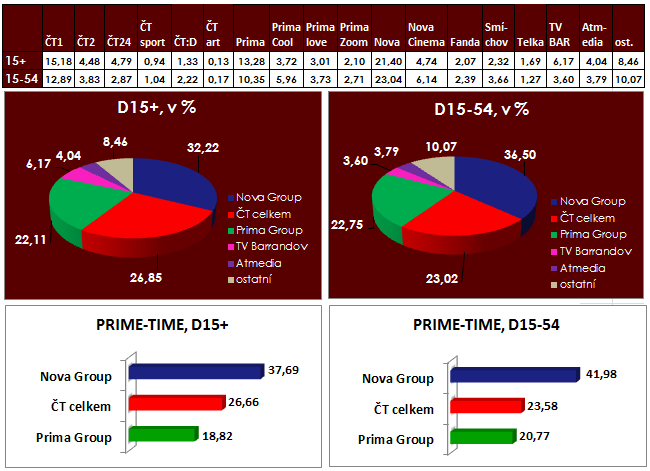 Seriál Chalupáři (TV Nova) opět jasně ovládl úterní večerní sledovanost. Společně s dalšími večerními pořady Novy, mj. Víkendové prázdniny přispěl k vítězství skupiny Nova v hlavním vysílacím čase. Sledovanost na úrovni půl milionu dosáhly večerní pořady ČT1 (Vinnetou, Jáchyme, hoď ho do stroje). Nadprůměrně si vedla TV Barrandov s německým filmem Katie Fforde, která tím předstihla i hlavní pořad TV Prima, českou komedii Jako jed.