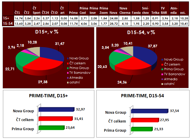Nejsledovanějším středečním večerním pořadem byl opět seriál Četnické humoresky (ČT1), který sledovalo v průměru 1,124 mil. diváků starších 15 let. Četnické humoresky tím získaly nejvyšší podíl jak v širší skupině, tak v mladší skupině 15-54. Ve srovnání s minulým týdnem se snížila sledovanost druhého dílu nového kriminálního seriálu Cirkus Bukowsky (ČT1), který oproti své premiéře klesl o více než 200 tisíc diváků a nepotvrdil tak nadprůměrná první čísla. Srovnatelných, resp. mírně lepších výsledků dosáhl druhý díl nového pořadu se Zdeňkem Pohlreichem Už dost, šéfe! (Prima). Fotbalové přenosy na Prima Cool a ČT Sport zůstaly pod hranicí 200 tisíc diváků.