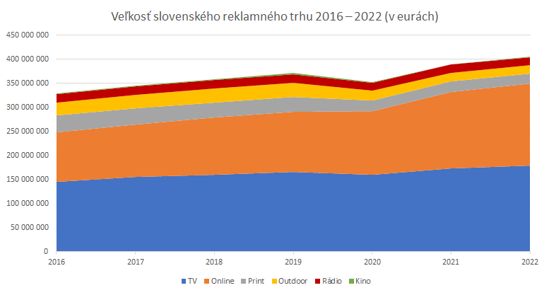Celkovo má slovenský reklamný trh v roku 2022 rásť o 4% na 405,3 milióna eur. Televízia porastie približne o 4,1%, online o 6%.