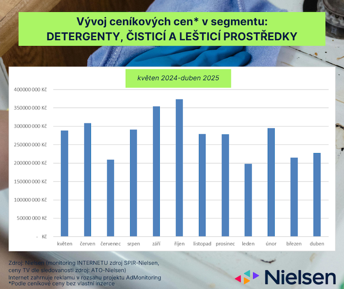 V období od loňského května do letošního dubna byly zaznamenány největší investice do reklamy v září a říjnu, což pravděpodobně souvisí s obdobím podzimního úklidu, kdy domácnosti více investují do čisticích prostředků. Druhý výrazný nárůst výdajů je vidět v květnu a červnu, které bývají spojeny s úklidem a přípravami na léto.