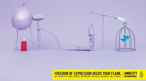 Amnesty International v loňském roce spustila kampaň z dílny belgické agentury Air. Kampaň se sloganem „Svoboda projevu potřebuje váš plamen“ (Freedom of expression needs your flame) upozorňuje na skutečnost, že polovina zemí toto základní lidské právo nerespektuje. Na velmi jednoduchém principu je ve spotech i printu ukázán kaskádovitý efekt, jak účast každého jedince dokáže pomoci svobodě projevu.