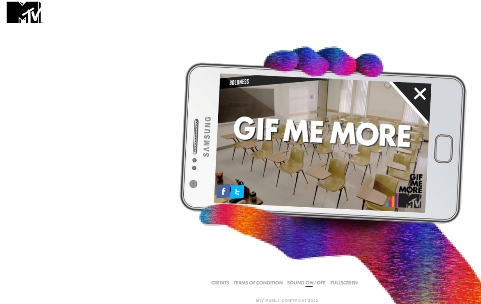 Společnost MTV Mobile Europe spustila interaktivní webovou stránku „GIF ME MORE PARTY“, kde mohla každý návštěvník za doprovodu hudby kalifornské skupiny Death Grips prožít bazénovou party očima jakéhokoliv z 50 účastníků. Kreativně je pod kampaní podepsána francouzská agentura Buzzman, webdesign pochází od studia Les 84.