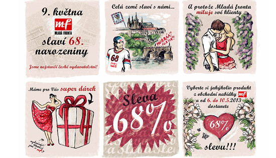 Vydavatelství Mladá fronta, které si letos 9. května připomíná 68. výročí své existence, přichází s narozeninovou slevou pro inzerenty, která představuje symbolických 68 %. Slevová akce 68 % se koná ve dnech 6. – 10. 5. 2013 a vztahuje se na všechny inzertní produkty vydavatelství Mladá fronta objednané v tomto termínu. Slevová nabídka platí pouze na pevně definované formáty podle platného mediakitu pro rok 2013 a termíny do 31. 12. 2013. Nevztahuje se na již objednané a rezervované pozice, na konference, klientské tituly a časopisy České lékařské komory a České lékařské společnosti Jana Evangelisty Purkyně. Finanční objem, na který je uplatněna výše uvedená sleva, se nezapočítává do uzavřených rámcových, objemových a bonusových smluv.