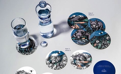 Podtácky s motivy přírody, které slouží k servírování pramenité vody Rajec, se při kontaktu se stékající vodou samy vybarví, po několika minutách barvy opět mizí.