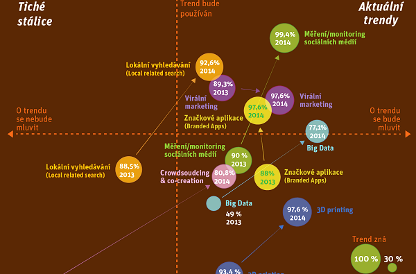 Stejně jako v minulých letech se mezi nejsilnějšími drží trendy z oblasti sociálních sítí a spojené s mobilními technologiemi. Výrazně si polepšil monitoring a měření sociálních sítí. Mnohé značky se zajímají o efektivitu vynaložených prostředků a zároveň se snaží zjistit, nakolik jsou součástí zákaznické konverzace.