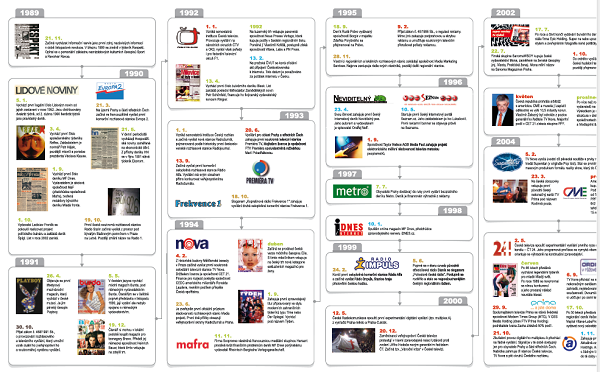 Čtvrtstoletí uplynulo od chvíle, kdy se česká mediální scéna po společenských změnách v roce 1989 vydala zcela novým směrem. Média se stala součástí ekonomického podnikání, nabídla do té doby u nás neznámé typy deníků, časopisů, televizních nebo rádiových pořadů. Ohlédněte se s MediaGuru.cz za milníky mediálního vývoje v posledních 25 letech a připomeňte si první titulní strany a loga českých médií. Výčet událostí pochopitelně nemůže být na této ploše úplný, věříme ale, že vás i přesto provede mediální historií ne tak nedávnou.