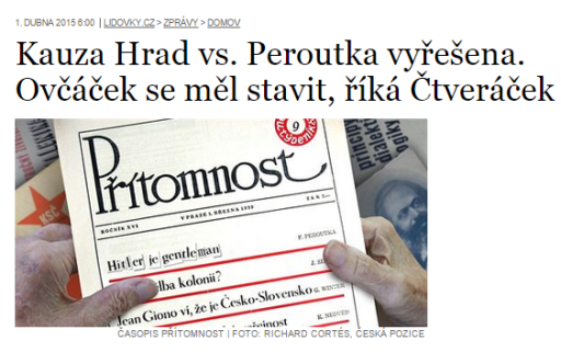 Lidové noviny věnovaly aprílovému žertu celou zadní stranu, na níž se dojde k rozuzlení kauzy Hrad versus Peroutka. Přinášejí exkluzivní rozhovor se spoluautorem Peroutkova článku Hitler je gentleman, s RSDr. Ladislavem Čtveráčkem, který vysvětluje, že článek byl součástí rozsáhlejšího projektu Kavárna o selhání demokratické inteligence ve 30. letech, zpracovaném metodickým oddělením VUML.