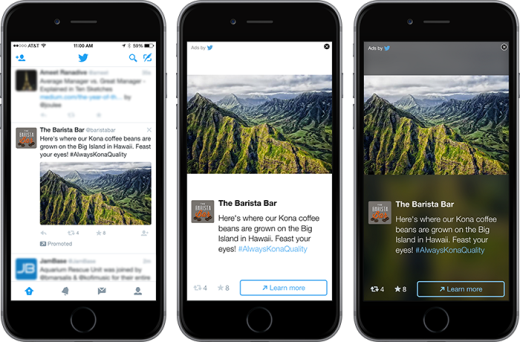 Další novinkou jsou call-to-action tlačítka jako „learn more“, které mají podpořit interakci uživatele se značkou. Twitter také přidal nové dva cíle pro plánování kampaní: engagements a video views a v plánu je do budoucna další rozšíření o kliknutí na web nebo konverze. I reklamní tweety zobrazené v mobilních aplikacích budou moci uživatelé retweetovat a označovat jako „favorite“.